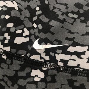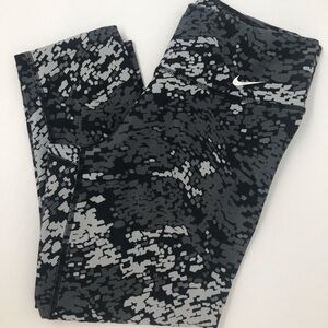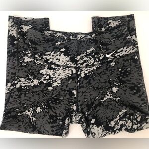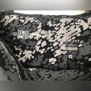 Nike Eco Athletic Workout Crops. Black and grays colorway. Abstract/ Camo print. Made from recycled plastic bottles. Small pocket on interior waste and to hold your key. Typical fit of athletic wear. Layflat Measurements: 13.5”, hips 16.5”, inseam 20”. Measurements taken without any stretching. Size Small.