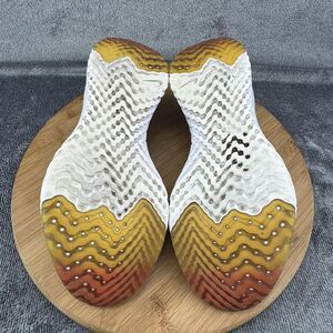 Color: Primarily white Flyknit upper with white Swoosh, orange and purple heel clip, blue React midsole accent, and gradient yellow to orange rubber outsole.