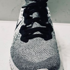 The shoe’s upper is constructed using PrimeKnit material which is lightweight and breathable and has a sock like fit, which further enhances comfort when wearing the shoes for extended periods of time. As for the color palette, the upper is half white and half grey and features dark accents on the laces, the Nike Swoosh and part of the heel area, which help to add a contrasting effect.