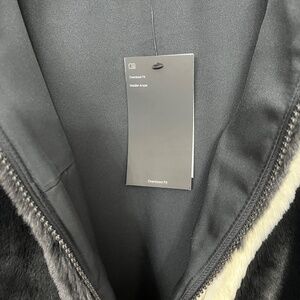 Nike Sportswear Women’s Faux Fur Swoosh Jacket. Black and ivory white. Style #DO3791-010. Full zip front closure. Stand collar. Lines. Side-seam pockets. 100% polyester. Dry clean only.