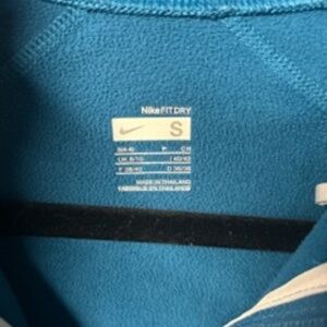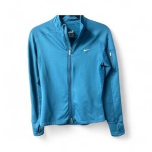 A Nike Classic! Perfect for everyday athletic leisure, track running or the gym. Made of breathable poly-spandex the jacket is cozy, light-weight and durable. Reflective markings on back for safety and thumbholes for versatility. Good condition. Pit to pit 17" and Length 26."