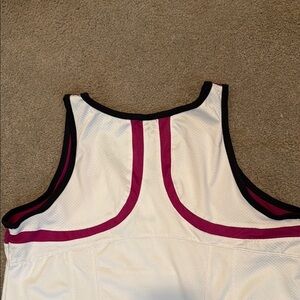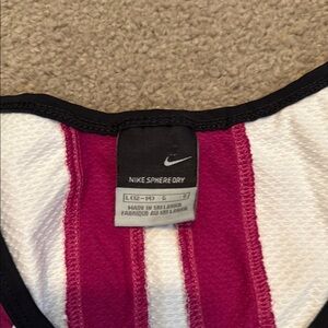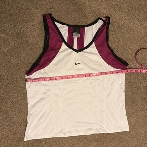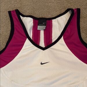 This Nike tank top combines a crisp white body with striking pink accents, offering a sleek and sporty look. The sleeveless design and fitted style ensure optimal comfort and flexibility, making it ideal for athletic activities. Crafted from performance fabric, it features a racerback cut for enhanced movement. Great condition.