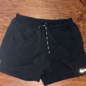 Experience ultimate comfort and versatility with Nike's black athletic shorts, designed with a lightweight material and an adjustable drawstring waistband. Perfect for workouts or casual outings, these shorts offer a standard mid-thigh length for optimal movement. Authentic Nike, purchased off of Nike.com. Back zipper pocket for personal items during a run. Inside brief-lined for added comfort. Barely worn.