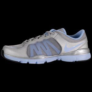 Nike Flex Trainer 2 sneakers. Lace Up style. Light blue and gray in color (called metallic silver and prism blue).