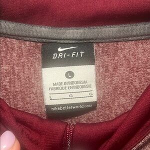 Stylish Nike quarter-zip pullover. Features a maroon color with a logo on the chest. Perfect for casual wear.