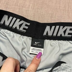 Experience comfort with Nike's athletic shorts. Gray body with blue side panels. Ideal for workouts.