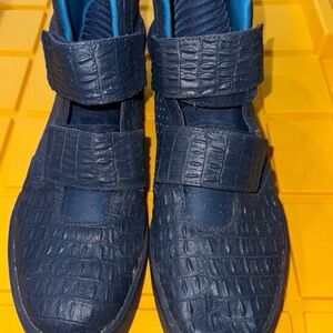 Stylish navy high-top sneakers featuring convenient Velcro straps. Perfect for casual wear.