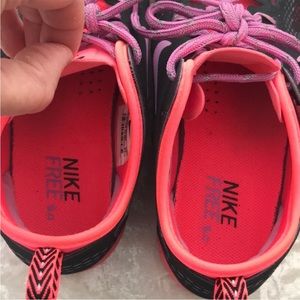 Nike Free 5.0 TR FIT 4. Black mesh upper with pink and purple accents. Stylish Nike athletic shoes. Perfect for sports and casual wear. Used good condition.