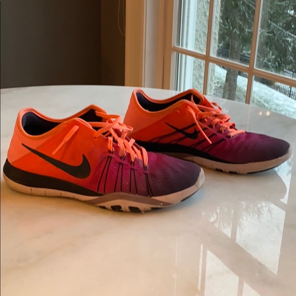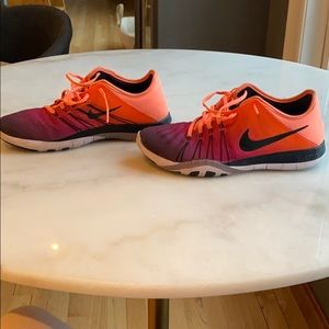 Nike Free orange to purple ombré trainers. There are a few scuff marks.