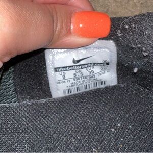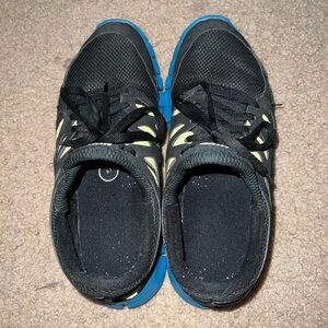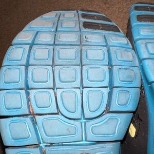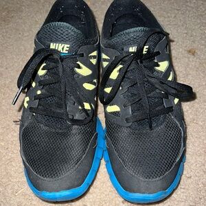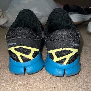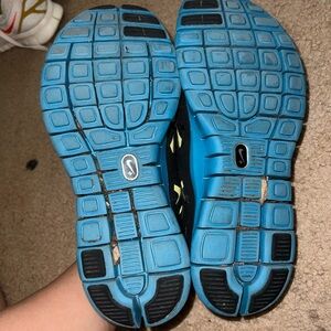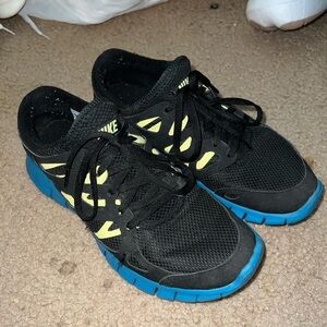 Women’s size 8 Nike Free shoes. No stains. Part of the swoosh has rubbed off on one (pictured.) A little worn. Please see tread pics. Black with bright blue and neon yellow.