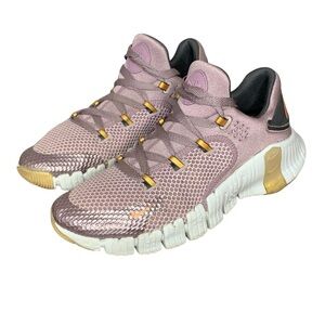Nike Free Metcon 4 PRM women’s running lace up shoe in Purple Smoke Metallic Copper. Shoes are Preowned and have some marks on gold see pics. Otherwise, really good condition. Size 11