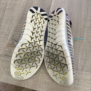 Nike Free RN Motion Flyknit Women's Running Shoes in size US 8, featuring a lace-up closure and a low-top shoe shaft style. These lightweight and breathable shoes are designed for activities like running, cross-training, and casual wear. The color scheme includes blue, pink , green and purple stripes, with the Nike logo as an accent. The model number is 834585-006