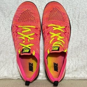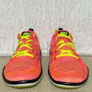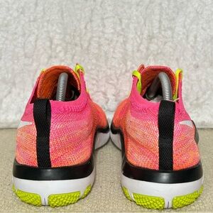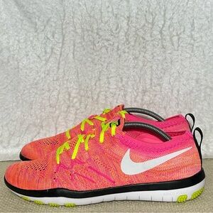 Nike Free TR Focus Flyknit Womens Orange Knit Running Sneakers Shoes. Color: Orange/Pink. Pre-owned Condition – refer to pictures. for description of shoes. No rips or tears. Smoke free.