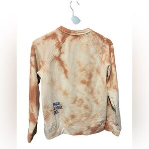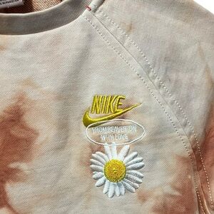 Orange tie-dye Nike crewneck sweatshirt with embroidered daisy and “From Beaverton With Love” on the front. “Have a Nike Day” graphic on the back. Ribbed cuffs and hem. Cotton-blend fleece. Excellent condition, no flaws noted.