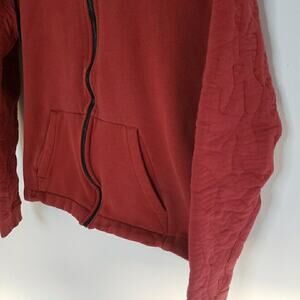 24" long 19" pit to pit. This Nike sweatshirt is perfect for the active woman who wants to stay comfortable while looking stylish. The hoodie features a full zip closure, pockets, and a vibrant red color that will make you stand out. The cotton blend outer shell material ensures maximum comfort, while the long sleeve design and athletic fit make it suitable for gym training, yoga, walking, and running during fall and spring. *small holes on right sleeve shown in photos