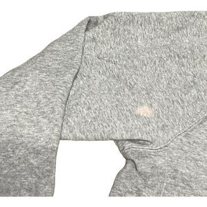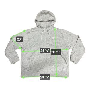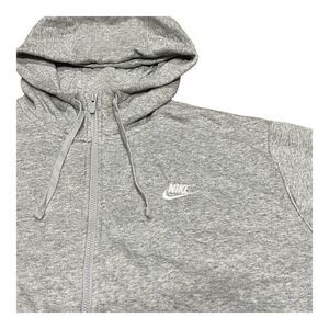 Elevate your streetwear style with this Nike Full Zip Up Gray Hoodie Sweatshirt Jacket. This vintage piece features a solid pattern, long sleeves, and a drawstring closure. The round neck and full zip style make it perfect for any occasion. The gray color and Nike logo accents give it a sporty feel, while the fleece fabric type keeps you warm in the winter, fall, and spring seasons. It comes in a size XL, making it a great fit for both men and women. The hoodie also features pockets, making it practical and functional for everyday wear.