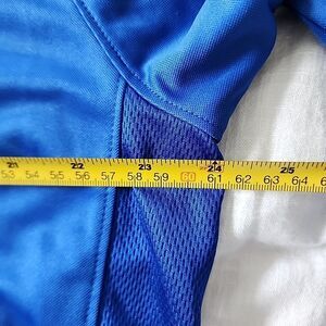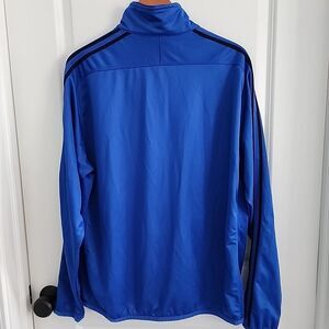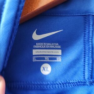 The Nike Full Zip-Up Track Jacket is a stylish and functional outerwear piece for men in size XL. Made of durable polyester knit fabric, this jacket features a stand-up collar, full zip closure, and convenient pockets. The blue and black color scheme adds a sporty touch, while the Nike logo accents the design. Perfect for fall and spring seasons, this lightweight jacket is ideal for various activities such as walking, baseball, basketball, and running. Easy to care for with machine washable instructions, this jacket is a versatile addition to any man's wardrobe.