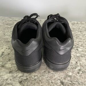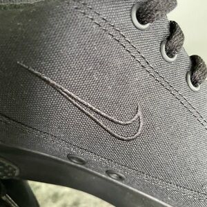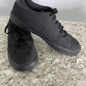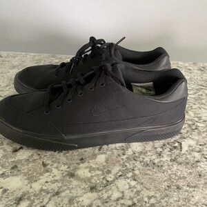 Nike sneakers feature a sleek all-black design with a low-top silhouette and traditional lace-up closure. Crafted with a durable black canvas upper and a flat rubber sole, they offer a comfortable fit perfect.