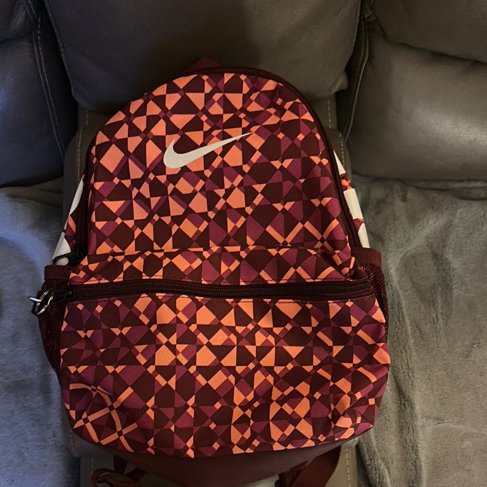 Stylish Nike backpack with a vibrant geometric pattern. Features a mix of purple , orange, and burgundy colors. Perfect for daily use.