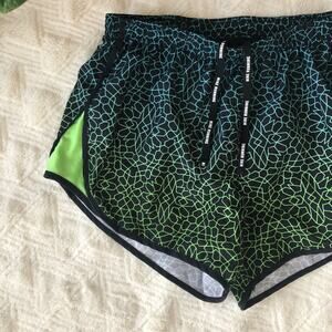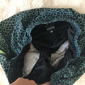 In good preowned condition. Lined. Drawstring. Black with blue and green print and green side panels.