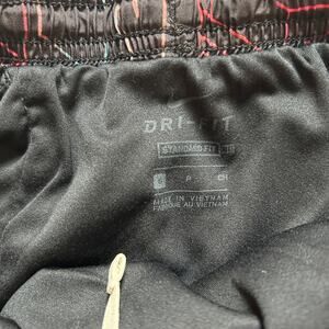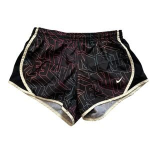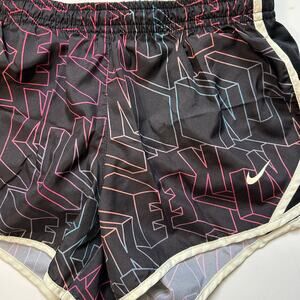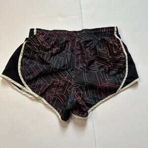 Super cute Nike youth shorts. These shorts are black with a geometric pattern in shades of pink, blue, and gray. They feature a white Nike swoosh logo on the lower right leg and white trim along the edges. VGUC. Smoke free and pet friendly (non-shedding) home.