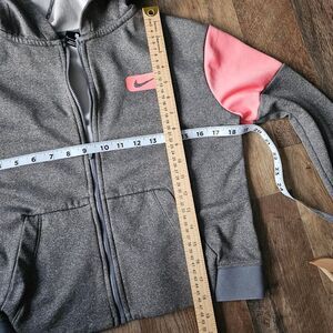 Grey and pink Dri-FIT big logo full-zip, pocket athletic hoodie; loose threads in one sleeve around the shoulder. Otherwise, in great condition. Fleece-lined.