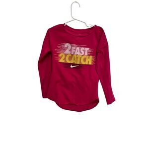 This Nike girls' T-shirt in pink features a "2 fast 2catch" graphic design. It is made from soft, breathable knit fabric, ideal for school, sports, or casual wear. The shirt has a short sleeve, crew neck, and athletic fit, suitable for spring. It is machine washable and in great new condition. Keywords: Nike, girls, pink, T-shirt, sports, activewear, graphic, breathable, athletic, casual, school, spring, crew neck, short sleeve.