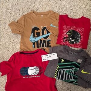 Stylish Nike set with a pink hoodie and pants. Includes a peach sweatshirt and leopard print leggings. Size 4-5