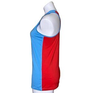 Nike Pro Racerback Logo Tank Top in blue and red. The sleeveless design and size XL provide a comfortable fit. Made from high-quality Polyester/Spandex blend.