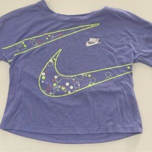 Soft lavender tee featuring a bold neon green Nike logo. Comfortable and stylish.