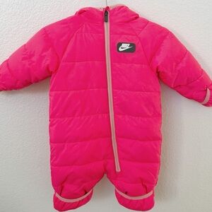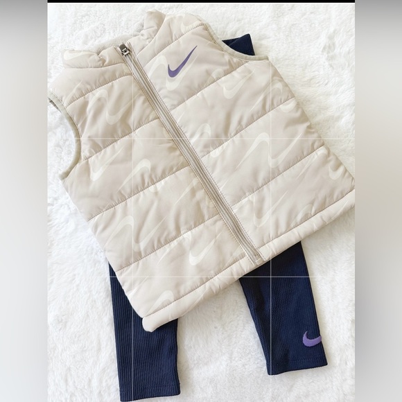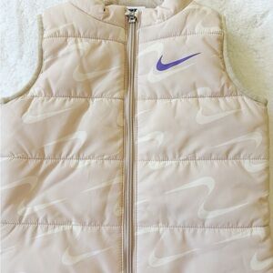 Very light pink/ cream color zip up vest with cream swoosh printed material and a purple swoosh on front.