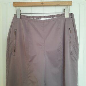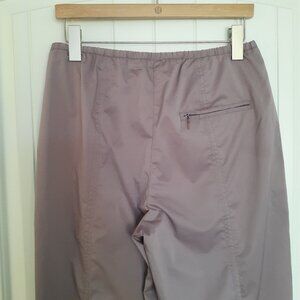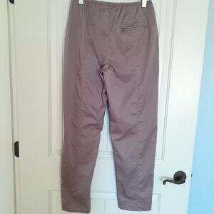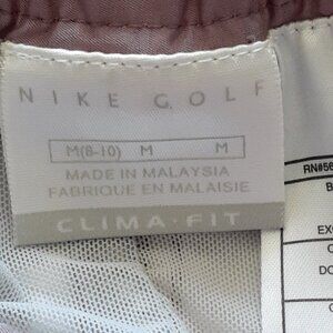 Very good pre-owned condition. Nike Golf Clima-Fit Pants with Mesh Lining & Ankle Vents. Size: Medium (8-10). Color: muted dusty purple. Poly/spandex blend. Machine wash. Left side zip entry, two front zipper pockets, one back zipper pocket, and zippered vents at ankles. Back of waist is elastic. Pants are mesh lined. Water and wind-resistant.