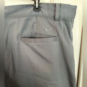 Nike Golf Dri Fit Standard Fit Shorts for men in size 40. These solid gray shorts feature a zip closure and a flat front design. Made of polyester and spandex, they have a 12" rise and 10.5" inseam. The shorts have a Nike Dri-FIT product line and are suitable for outdoor activities like golf. They include pockets, button and zipper accents, and the Nike logo, embodying an athletic style for casual or activewear occasions.
