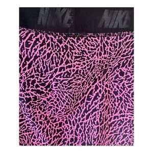 Nike Golf Dri-FIT Skort in size Large. Features an eye-catching pink and black abstract pattern, comfortable wide elastic waistband with Nike branding, and built-in black compression shorts for added support. Designed for performance on the course or casual athletic wear.