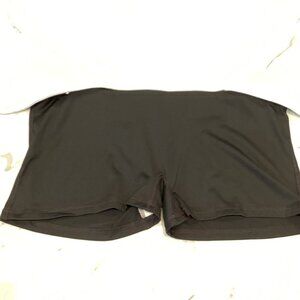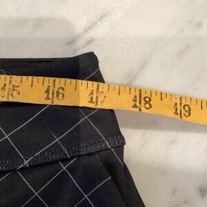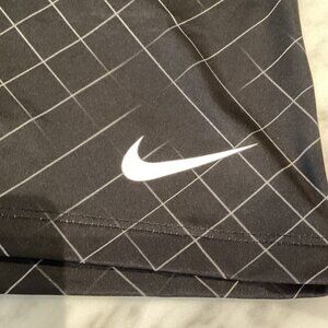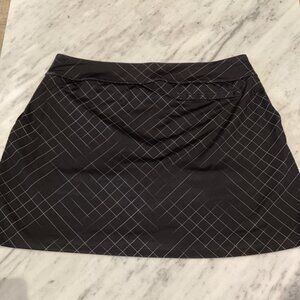 - Description: Nike Golf skort with side pockets and back pocket. Black background with faint gray/white lines. Black undershorts. Elastic waistband. Pull-on style. Straight fit. Nike logo on left thigh area. Perfect for a day on the course.