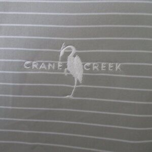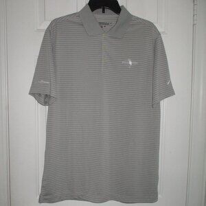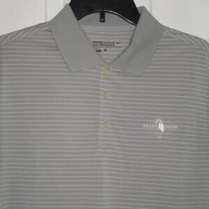 Nike Golf Dri-Fit Mens S/S "Crane Creek" Country Club (Boise, ID) Gray Polo Shirt. Size S-M*. Armpit-to-armpit 21", Length 30". 100% Polyester in Gray/White Stripe. *Labeled Medium however measurements & actual fit suggests the Smaller, Narrow side of Medium.