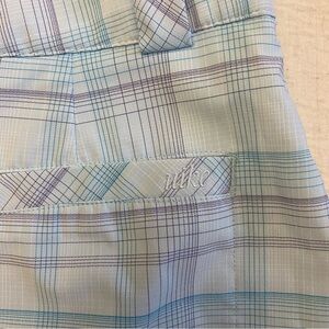 Elevate your golf game with this stylish Nike Golf Dri-Fit Plaid Skort. The pull-on design with a modern rise waistline ensures a comfortable fit throughout your game. The blue plaid pattern and outdoor theme add a touch of fashion to your sporting attire. The skort features a built-in liner short for added convenience and lined for enhanced coverage. This skort is perfect for casual occasions on and off the golf course. There is a little permanent marker mark on the inside of the skort where it says nike, but other than that it is in excellent condition.