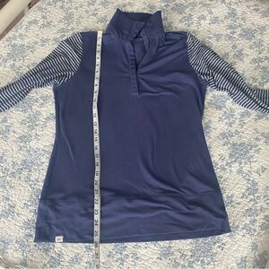 This long sleeve quarter snap top is by Nike Golf. It is blue with blue and white striped sleeves. It has snaps down the front with a collar that can be snapped up or left open. It is a dry fit top. Size Large. Measurements in photos. Excellent pre-owned condition with no flaws.