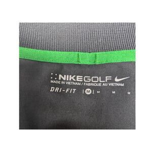 Men’s Nike Golf Dri-Fit polo shirt from the 2010 PGA Championship held at Whistling Straits. Features a modern horizontal stripe pattern in black, gray, and green with a detailed embroidered tournament logo patch on the chest. Made from a moisture-wicking, stretch-blend fabric (91% polyester, 9% spandex), it’s designed for performance on the course or casual wear. Classic three-button placket with structured collar. Size medium. A great find for golf fans, tournament collectors, or those wanting stylish athleticwear.