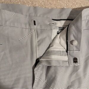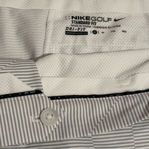 Nike golf men's shorts, featuring a gray and white pinstripe pattern and Nike's Dri-FIT technology.