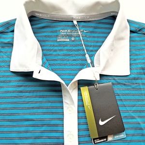 Brand new Nike Golf Tour Performance tournament golf shirt. White collar polo 5 buttons concealed. Discontinued colors teal with thin grey and black stripes. Dri-Fit cooling technology. Sweat band in collar. Poly/spandex blend. Look cool, feel cool, hit the green with a cute fitted top.