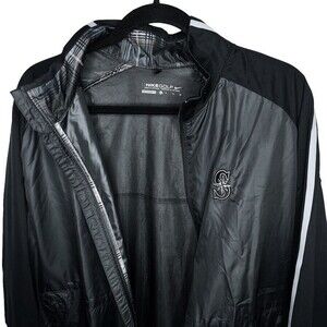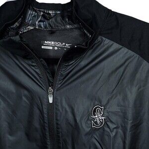 Men's Nike Golf Full Zip Wind Jacket, size Extra Large. In excellent condition with minimal visible wear! Seattle Mariners logo embroidered in subtle black & gray on chest. This windproof jacket is also water-resistant, so it's ideal for cool weather play. The Nike Stretch material allows freedom of motion that won't restrict your swing, allowing you to swing aggressively and play with confidence. Full zip front with top-down and bottom-up zippers, and mock neck with Nike swoosh logo. Two zippered hand pockets. Blue, gray, & black plaid detail on inside of collar.