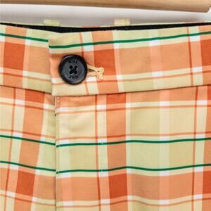 The Nike Golf Shorts in mens size 34 are a stylish and practical choice for casual occasions. These yellow and orange plaid shorts feature an elastic waist with a logo accent, providing a comfortable and secure fit. Made from a lightweight and breathable polyester and spandex blend, these shorts are quick-drying and moisture-wicking, making them perfect for summer and spring days. With a low rise and 11-inch inseam, these chino-style shorts also have slash pockets for added convenience. Easy to care for with machine washable fabric, these shorts combine fashion and functionality for the modern man on the go.