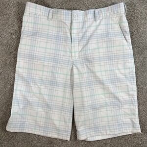 Nike Golf Shorts Men's 36 White Blue Green Plaid Flat Front Performance Stretch