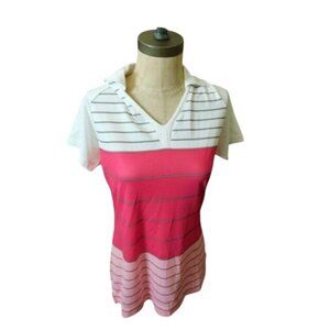 Elevate your golf game with this Nike Golf Tour Performance shirt. Designed with Dri-Fit technology, it keeps you dry and comfortable on the course. Perfect for any golfer looking to enhance their performance while staying stylish and cool. Vneckline, collared neckline, cap sleeves, dotted breathable striped fabric, from the tour performance collection