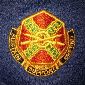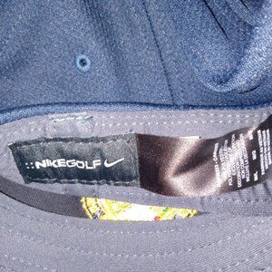 This Nike Golf Navy blue cap hat features embroidery of “Stay Army” on the side with a embroidered badge crest on the front “Sustain-Support-Defend” with two crossed swords in front of crossed chains. Authentic Nike swipe. Features Dri-fit mesh to keep you cool and comfortable, whether you are on the golf range or otherwise enjoying the outside weather. It does have a former owner’s name (Dan) on the inside of the brim but this is barely noticeable and otherwise in excellent used condition. This is a fitted cap hat, not with an adjustable strap, in size medium/large.