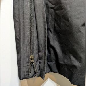 Nike Golf Storm Fit Windbreaker Pants in size Medium feature an elastic and adjustable waistband measuring approximately 15.5 inches, with a 32-inch inseam. These black men's pants are in excellent condition and include zippers at the bottom of each leg for easy adjustment, along with open pockets on both sides and a back pocket for added convenience.