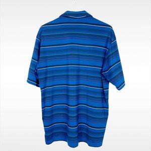 Nike Golf fit dry short sleeve polo shirt. Blue, black & greens striped. Self-fabric collar. 3 button placket. Fabric: 88% Polyester; 12% Spandex. In excellent condition. Color may vary with lighting or device.