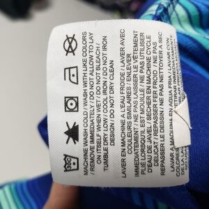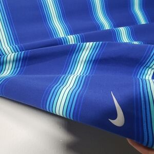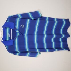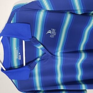 Nike Golf shirt with blue and green stripes. Features Dri-FIT technology for comfort.