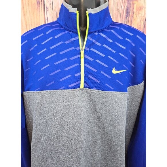 Elevate your golf game with this Nike Golf Tour Performance pullover. Featuring Dri-Fit technology for moisture management, this stylish half-zip is perfect for keeping comfortable on the green. Its modern design with a striking blue and gray color scheme makes it a standout piece in any golf wardrobe.